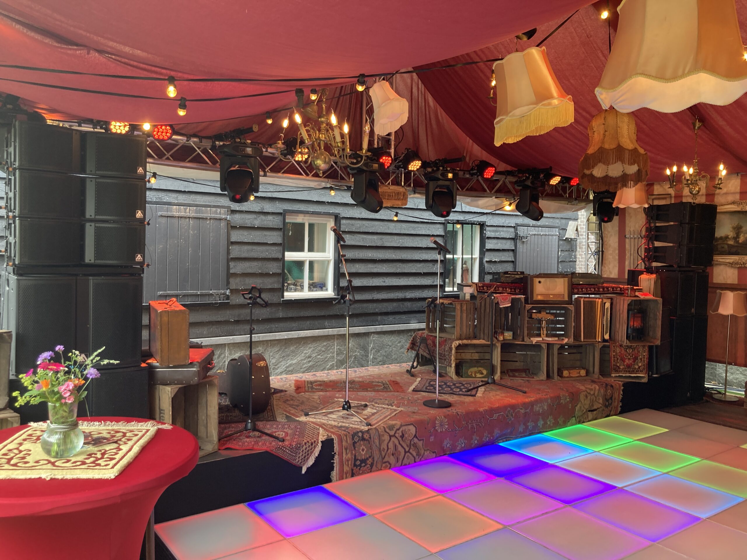 VAN OMBOUW, TENT, INTERIEUR, GELUID, VIDEO EN LICHT.